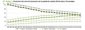 La última edición del Sistema Estatal de Indicadores de la Educación (2021), que reúne las principales estadísticas oficiales en esta materia, destaca grandes cambios en el nivel educativo de la población de 25 a 64 años desde el año 1992 hasta 2020, entre ellos que la proporción de personas con estudios inferiores a la segunda etapa de Secundaria se ha reducido prácticamente a la mitad (del 76 al 37,1%); que hay el doble de personas con estudios de segunda etapa de ESO (del 11,3 al 23,2%) y que el porcentaje se triplica para Educación Superior (del 12,8 al 39,7%), que engloba Universidad y FP de Grado Superior.