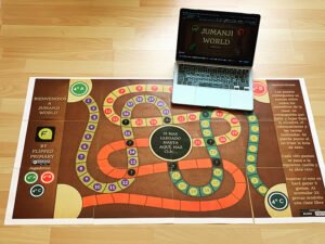 Jumanji World es una gamificación que se plantea para el área de Educación Física en 4º de Primaria, en la que a través de una narrativa envolvente y atractiva, utilizando el tablero de Jumanji, mi alumnado debe intentar trabajar en equipo para conseguir la mayor cantidad de puntos en cada sesión, poder avanzar de casillas en las que hay escondidos retos físicos y si lo logran tienen como premio cinco gemas. Cuando hayan logrado entre todos 25 gemas, la recompensa es tener un día de juego libre en EF, pero donde todos y todas deben jugar a lo mismo, juntos, para lo que deben realizar un debate, exponiendo sus juegos y llegando a un acuerdo para ver cuál es la mejor opción o la más votada.