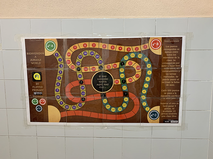 Este curso, para que todo el alumnado tenga referencias sobre la casilla en la que se encuentra cada sección, he impreso el tablero en tamaño póster utilizando la web blockposters.com y así cada vez que suban y bajen por las escaleras del centro, sepan por dónde van avanzando y por donde se encuentran las otras dos secciones”.