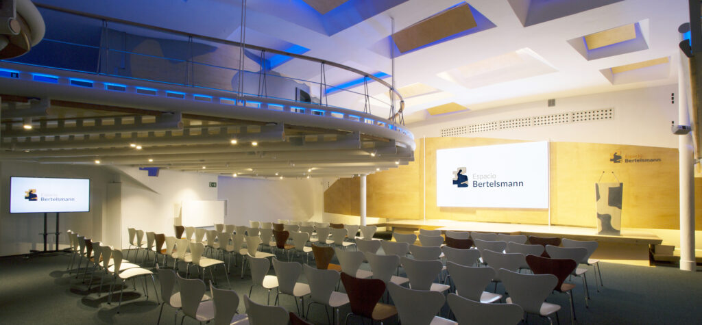 Todo ello en un espacio que, como explica Francisco Belil, vicepresidente de la Fundación Bertelsmann, “desea reforzar nuestro compromiso por el empleo juvenil a través de eventos y ser altavoz del conocimiento de nuestra matriz alemana en temas internacionales”. Se trata de un espacio polivalente, compuesto por diferentes zonas, entre ellas, una de networking, donde se combina una arquitectura singular con un equipamiento técnico y audiovisual de alta calidad.