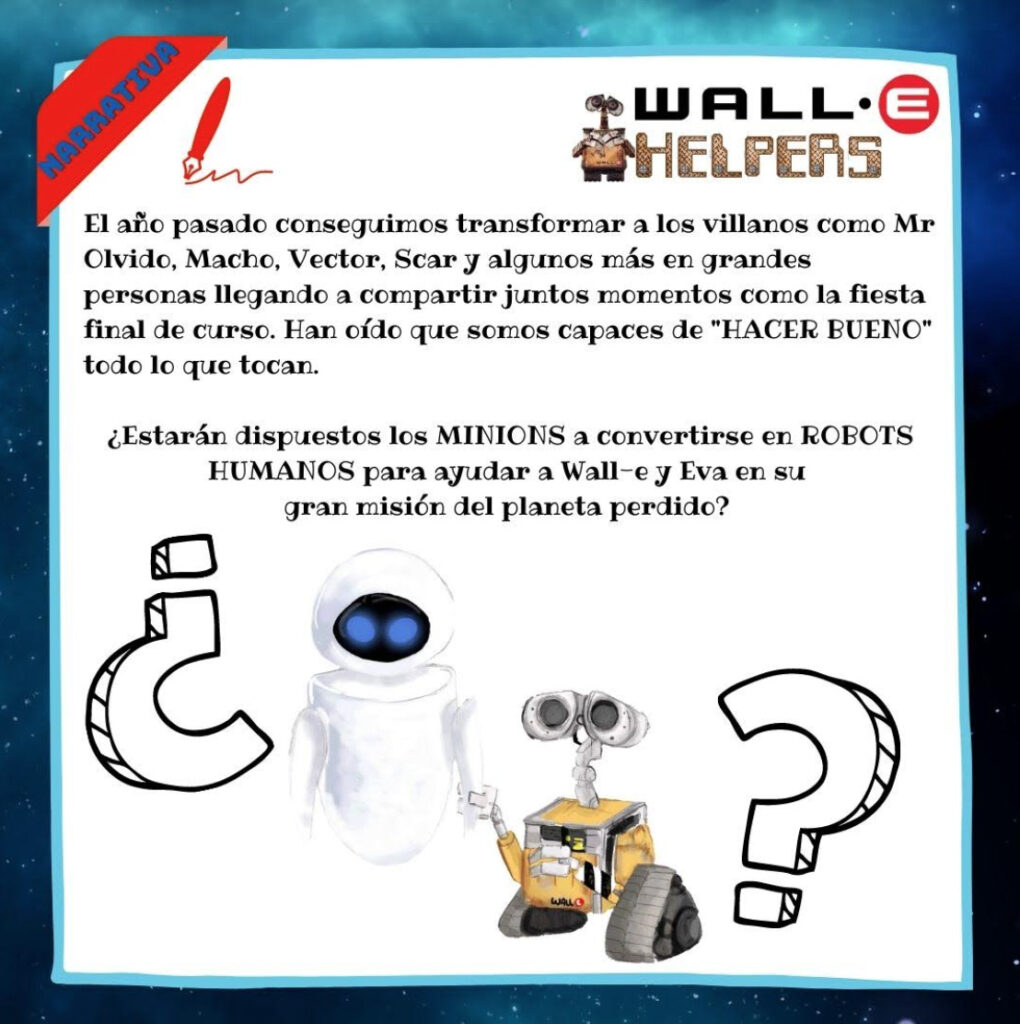 - Colaborar entre los diferentes batallones de “Wall-e Helpers” para vencer a un villano en los retos (actividades-tareas) que nos vayan lanzando o también colaborar para crear la narrativa de nuestra aventura.