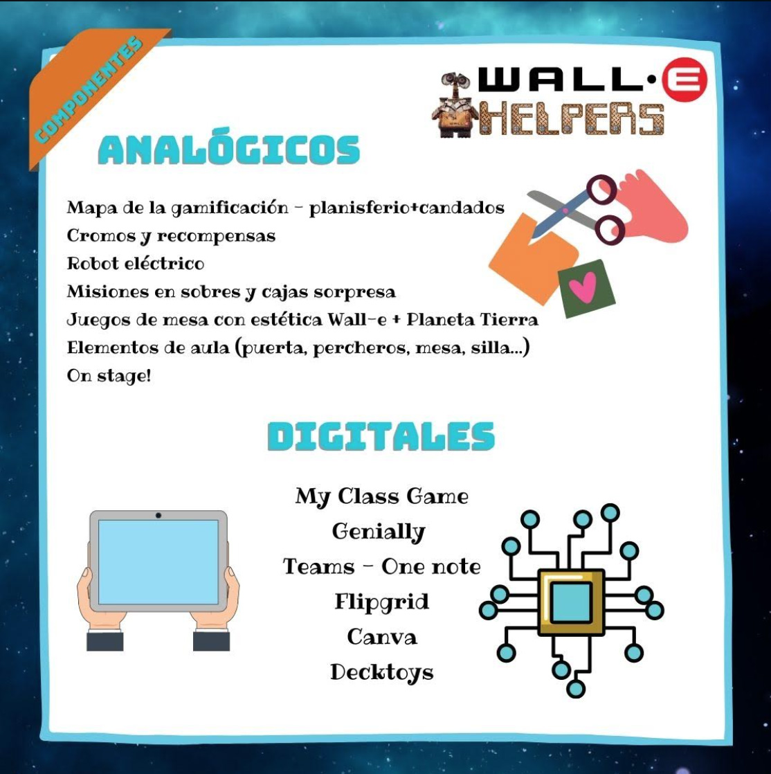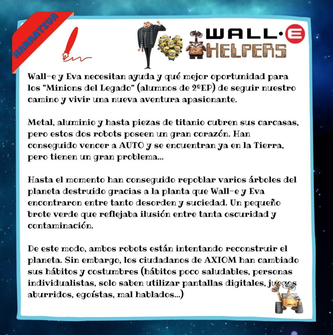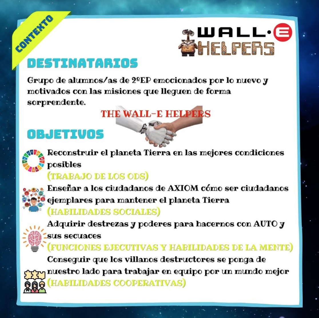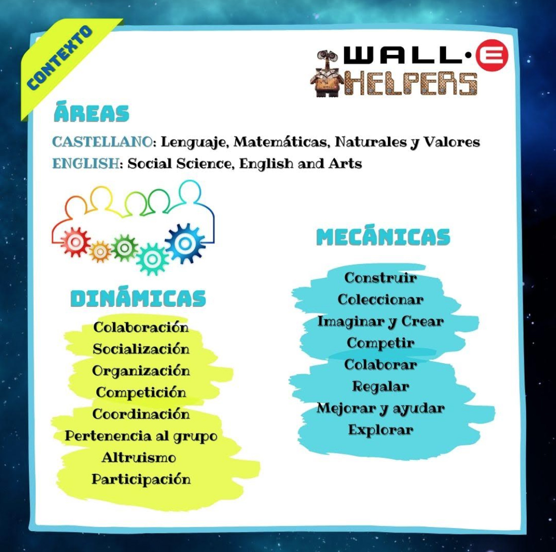 El proyecto lleva por título “The Wall-e Helpers” y está diseñado al milímetro con todo lujo de detalles: “Este curso, los alumnos/as de 2º EP aprendemos los contenidos de las diferentes asignaturas por medio de un proyecto gamificado basado en la temática de la película Wall-e. De esta manera, tratamos de desarrollar los aprendizajes de aula a través de las aventuras de un pequeño robot con grandes habilidades, junto a Eva y otros robots del batallón de limpieza. Las unidades didácticas las transformamos en misiones que debemos cumplir, los estudiantes somos “The Wall-e Helpers” y nuestras “notas” se convierten en “puntos de oxígeno” que necesitamos para salvar el planeta Tierra”.