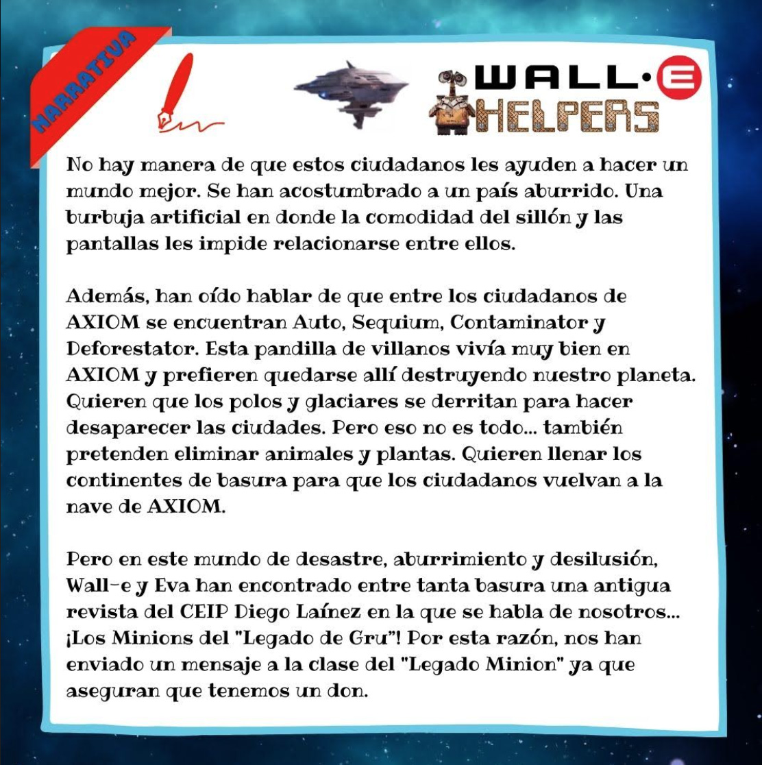 - Mejorar y ayudar por medio de los mensajes que Wall-e transmite en cada misión. Necesitan a los alumnos/as del CEIP «Diego Laínez» para poder conseguir que los ciudadanos de Axiom aprendan a vivir en la Tierra y la cuiden como se merece. “The Wall-e Helpers” se comprometen a ayudar en estas misiones superando los niveles y mejorando día a día.