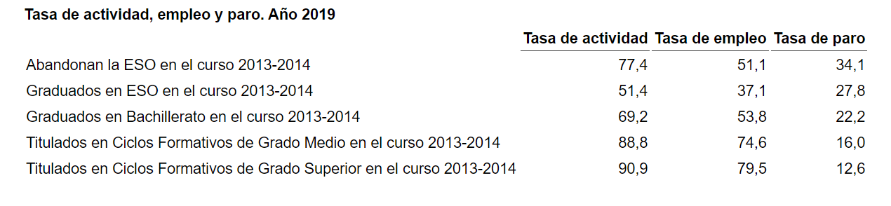 Pero vamos a los datos, que son más que las percepciones, lo que nos puede permitir tomar decisiones acertadas. La tasa de paro en 2019 de los titulados en FP Grado Superior en el curso 2013-14 fue del 12,6%. La de los titulados en FP Media del 16% y la de los de Bachillerato del 22,2%, según ha destacado recientemente el profesor Ismael Sanz en Twitter a partir de la Encuesta de transición educativa-formativa e inserción laboral del INE.