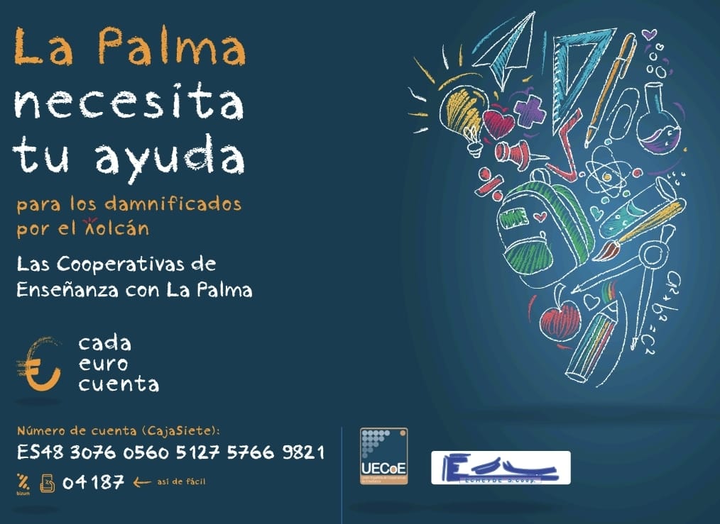 La Unión Española de Cooperativas de Enseñanza (UECoE) y las Cooperativas de Enseñanza se han movilizado ante la dramática situación social y económica derivada de la erupción volcánica en la isla de La Palma con la campaña Las Cooperativas de Enseñanza con La Palma, para ayudar y colaborar con la población palmera estudiantil en situación de vulnerabilidad.