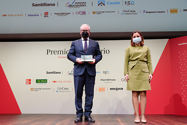 El director general de Formación del Profesorado, Régimen Especial y Equidad Educativa de Castilla y León, Agustín Francisco Sigüenza, recoge el premio de Irene Cuquerella, Head of Marketing and Sales Support del Sur de Europa.