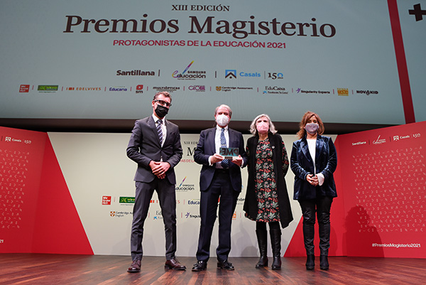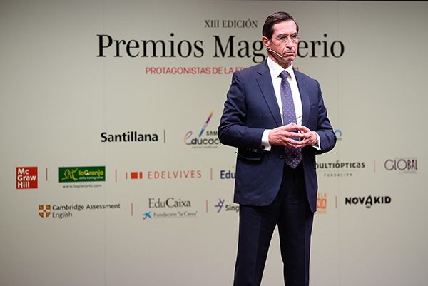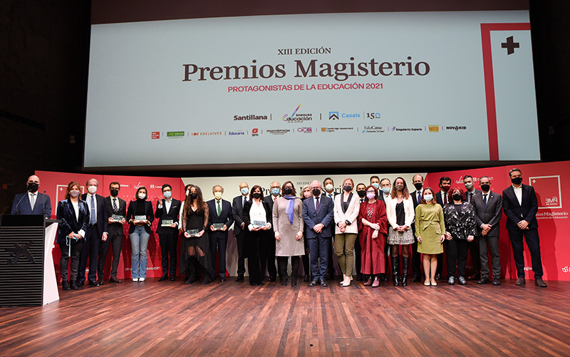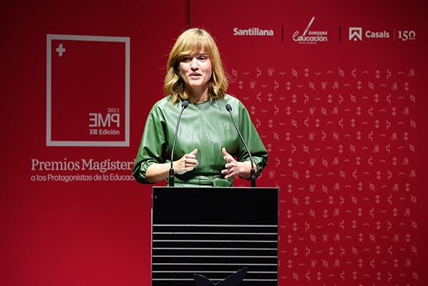 - «Y el gracias, por terminar con un punto de optimismo y esperanza, es a lo más nuclear que tiene el sistema educativo: nuestros estudiantes, que nos han dado una lección durante estos dos años de pandemia, en que se han adaptado a lo híbrido, a lo semipresencial, a lo no presencial, y, porque los verdaderos protagonistas de esta noche pero también de los Premios Magisterio son los maestros y maestras de este país, una palabra que a mí me encanta, más de 750.000 profesionales que cubren cada mañana todas las escuelas de nuestro país, a los que dejamos lo más preciado que tenemos, nuestros hijos. Gracias por el magnífico trabajo que hacéis, desde el punto de vista educativo, pero absolutamente integral, porque ayudáis a que nuestros hijos se formen desde un punto de vista educativo pero también madurativo y personal. Así que enhorabuena y muchas gracias por vuestro trabajo y por vuestra labor, que es absolutamente impagable».