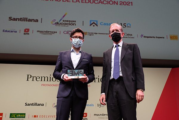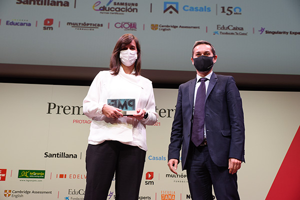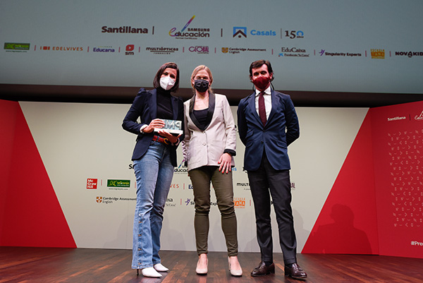 - Cristina Villalonga, directora de Global Campus Nebrija, recogía el premio a su modelo de presencialidad híbrida acompañada del rector de la Universidad Nebrija, José Muñiz, que destacaba la capacidad de reacción de Villalonga, que supo ver a tiempo que las reglas de funcionamiento de la enseñanza presencial no se podían trasladar linealmente al entorno virtual y ensalzó su perfil, difícil de encontrar, siendo a la vez tecnóloga sofisticada y apasionada de la Educación, así como su liderazgo, obligando a todos a seguir esta metodología.