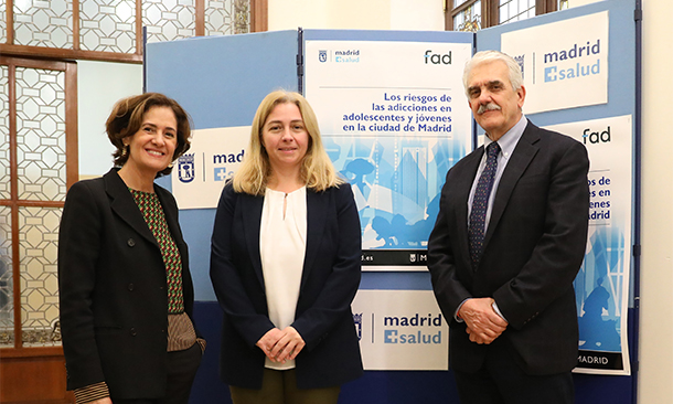 La delegada de Seguridad y Emergencias y portavoz municipal, Inmaculada Sanz; el gerente de Madrid Salud, Antonio Prieto; y la directora general de la FAD, Beatriz Martín, presentaron los resultados en una jornada sobre el riesgo de las adicciones en adolescentes y jóvenes organizada por Madrid Salud y la FAD. Durante la misma, Sanz destacó que para afrontar estas situaciones, “el Ayuntamiento, a través de Madrid Salud, ofrece a los ciudadanos programas dirigidos a la prevención y atención de las adicciones en adolescentes y jóvenes y a la lucha contra el consumo de drogas”. En esa línea, dijo que en 2019 los servicios municipales de Madrid Salud atendieron a más de 17.000 jóvenes y adolescentes y a cerca de 2.000 familias.