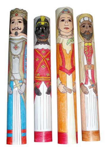 En principio, esta manualidad consiste simplemente en forrar cada rollo de cartón con un folio blanco (de momento sin pegarlo, sólo para recortar lo que sobre del folio), extender el folio sobre la mesa para dibujar y colorear en él una figura, y volverlo a colocar (esta vez con pegamento) sobre el rollo de cartón. Las figuras que puedes dibujar pueden ser, por ejemplo, los gigantes de tu localidad (en la fotografía, varios gigantes de Pamplona), jugadores de baloncesto (puedes recortar sus caras de alguna revista y dibujar el resto del cuerpo), torres bonitas (todas distintas, con un montón de ventanas, escaleras y almenas), etc.