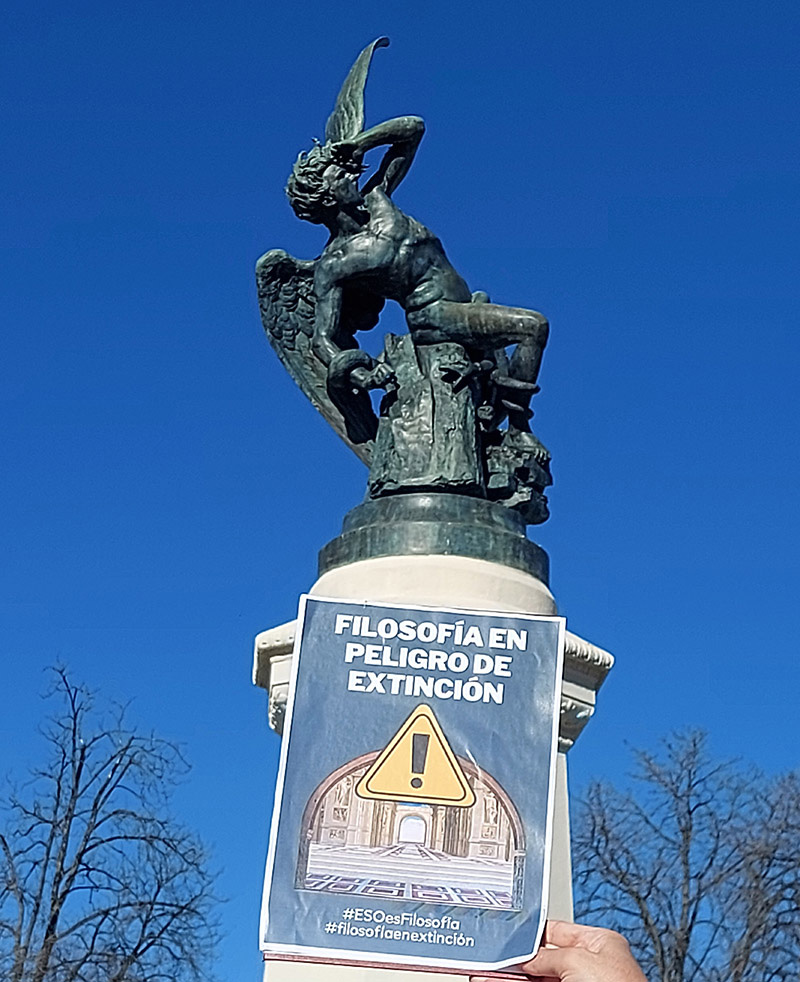 Con los hashtags #ESOesfilosofia y #Filosofiaenextincion, se trata de una acción de cartelería bajo ese lema realizada por docentes y estudiantes de Filosofía que han fotografiado espacios y lugares simbólicos y/o emblemáticos.