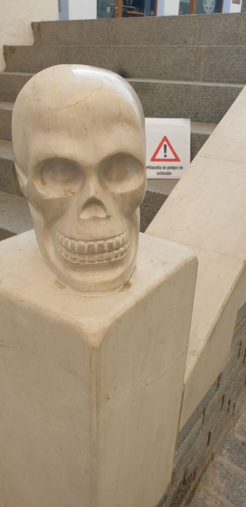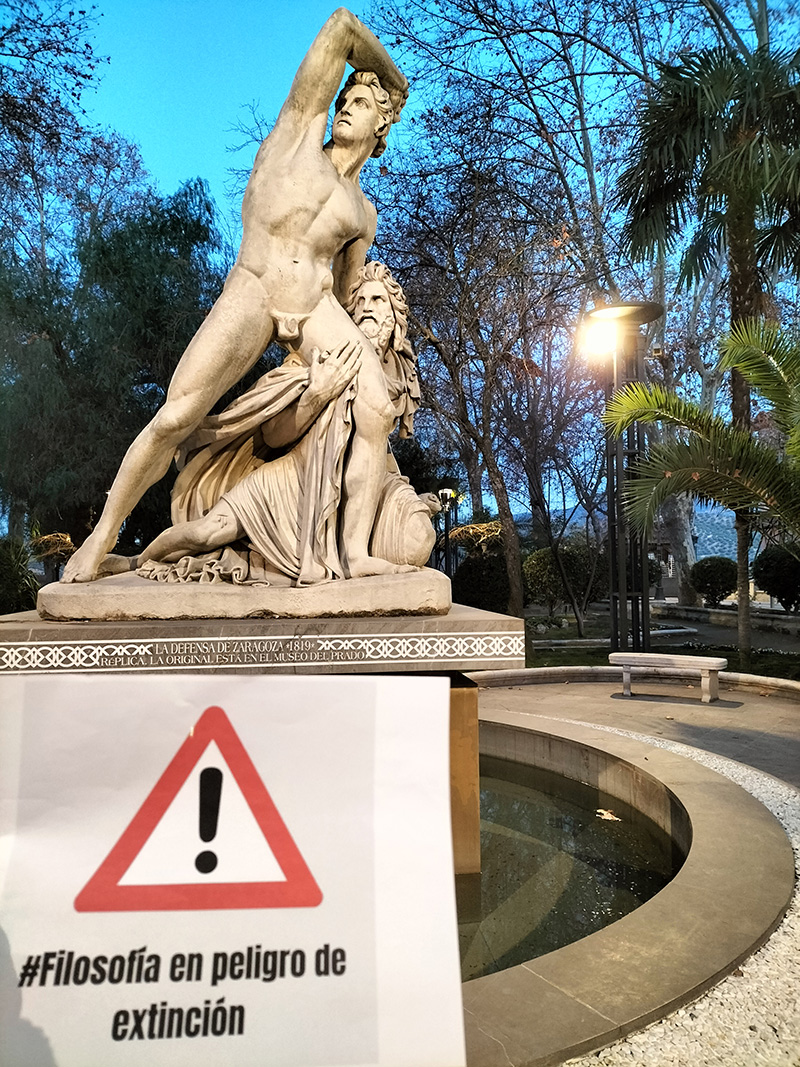 Con los hashtags #ESOesfilosofia y #Filosofiaenextincion, se trata de una acción de cartelería bajo ese lema realizada por docentes y estudiantes de Filosofía que han fotografiado espacios y lugares simbólicos y/o emblemáticos.
