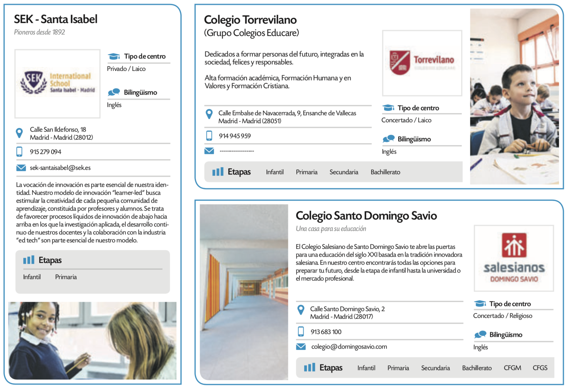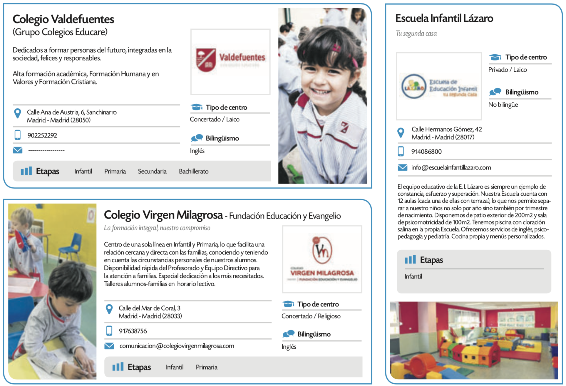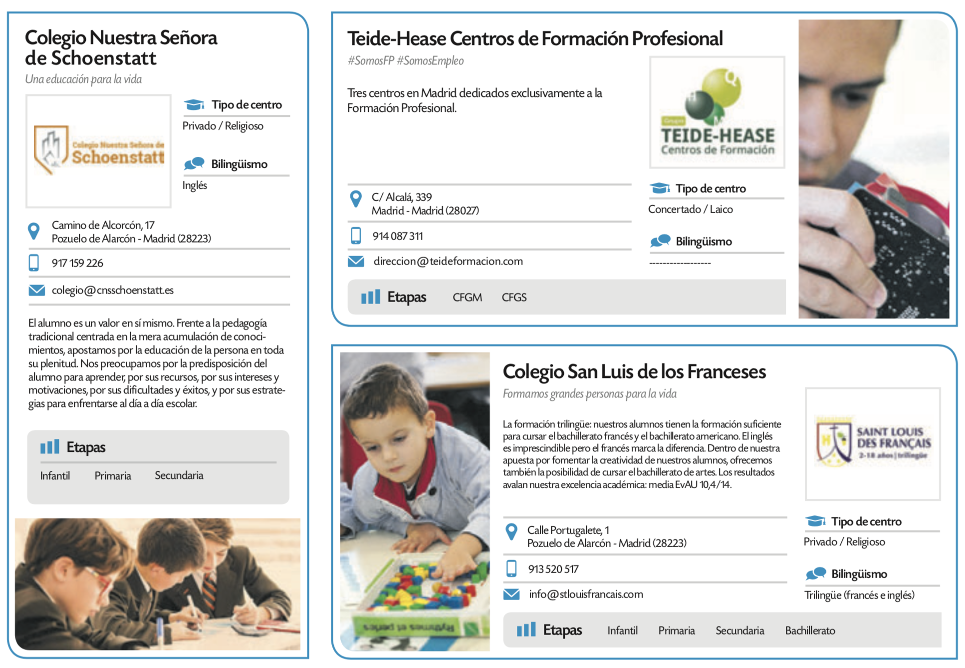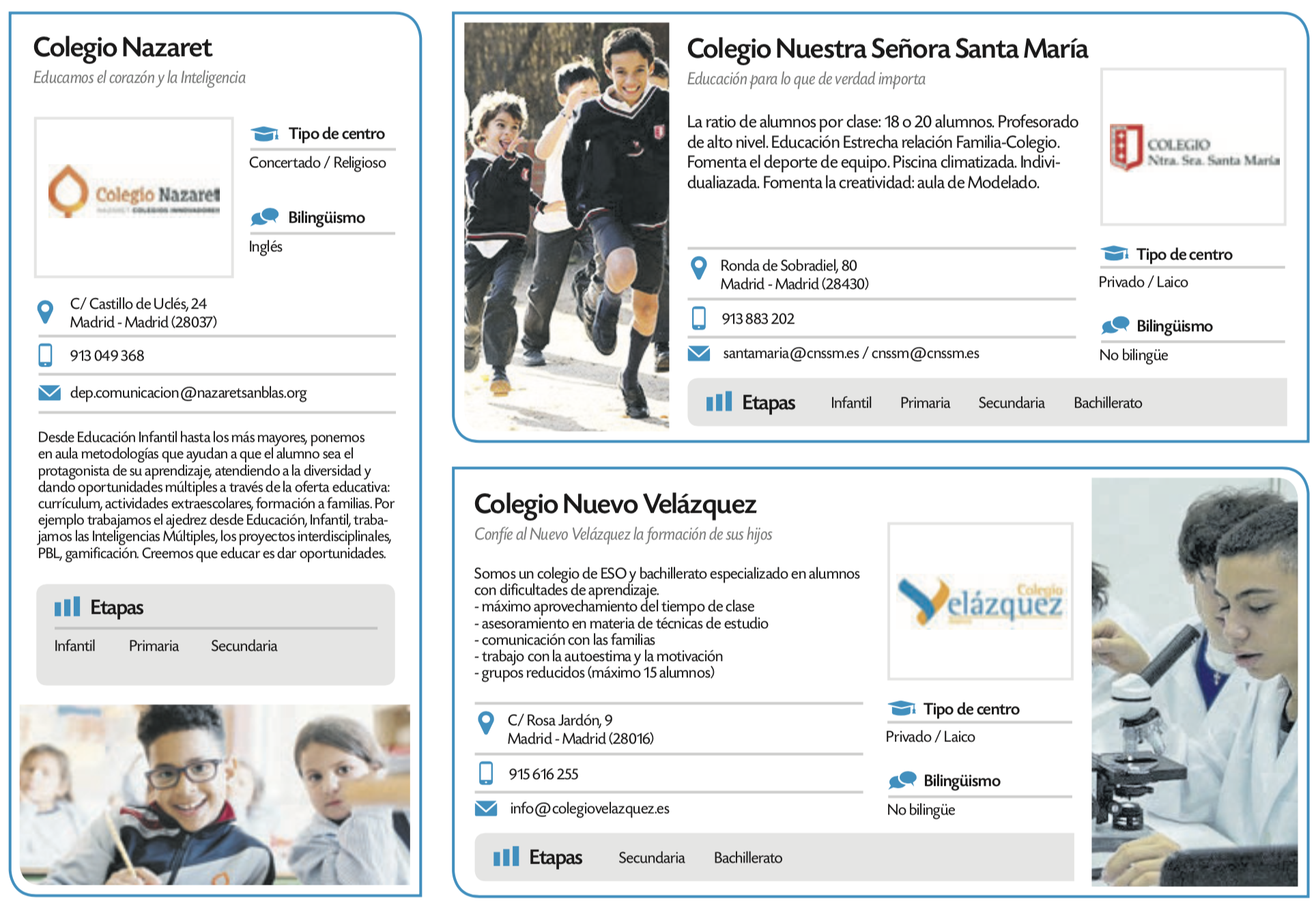 En la Comunidad de Madrid hay alrededor de 1.600 colegios donde cada año arrancan su educación más de 60.000 niños. Muchos se pasarán los próximos 9 años en sus aulas. Habrá quienes incluso lleguen a estar 15 años en el centro hasta finalizar el Bachillerato. La decisión no es fácil. Hay colegios bilingües y trilingües. Colegios que apuestan por el trabajo por proyectos o que ponen el foco en la inteligencia emocional. Los hay que aplican metodologías Montessori y quienes ponen de relieve su propia metodología. Los hay religiosos y laicos. Algunos han implantado formas de trabajar importadas de países nórdicos y otros han creado equipos de investigación para mejorar sus proyectos. Y todos ellos pueden ser públicos, privados o concertados. Es decir, las familias se tienen que enfrentar a una decisión muy compleja. Deben elegir entre miles de opciones distintas cuál es la que mejor se adapta a lo que esperan de la educación de su hijo. Desde la Feria de los Colegios os queremos ayudar a facilitar esta decisión.