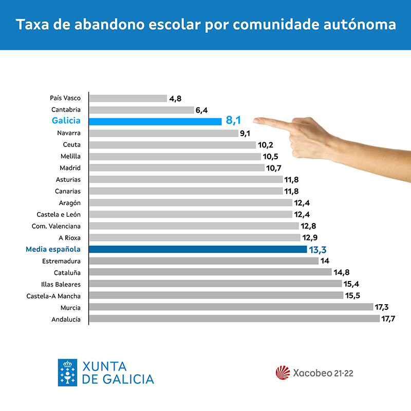 Se trata, además, de la mayor caída interanual de esta tasa en Galicia desde que existen registros, según informa la Xunta. La comunidad gallega se situó cinco puntos por debajo respecto a la media nacional, que fue del 13,3% y se colocó entre las tres comunidades autónomas con mejor tasa de éxito escolar. Solo la superaron País Vasco (4,8% de abandono) y Cantabria (6,4%). Desde 2009 (cuando hubo un abandono escolar del 25,8%), esta tasa se ha reducido en 17,7 puntos.