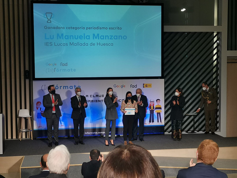 La alumna del IES «Lucas Mallada» de Huesca, Lu Manzano, ha recibido a manos de la reina Letizia el premio del concurso Info_Influencers, un concurso organizado por la Fundación de Ayuda contra la Drogadicción con la colaboración de Google y del Gobierno de España, y que trata de promover en los adolescentes la habilidad y la voluntad de acceder a la información ofrecida por los medios tradicionales y el contexto online con pensamiento crítico.