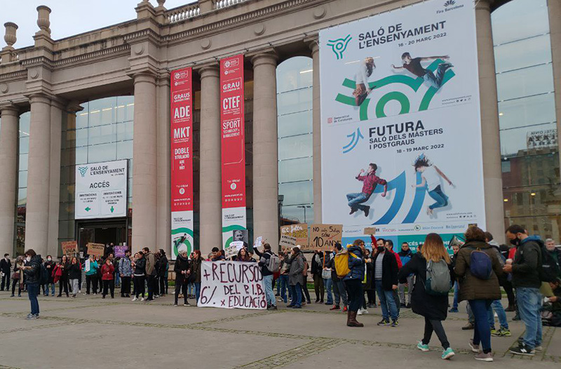 Los manifestantes se han concentrado frente a la entrada del Salón de la Enseñanza de la Fira de Barcelona. © Aspepc
