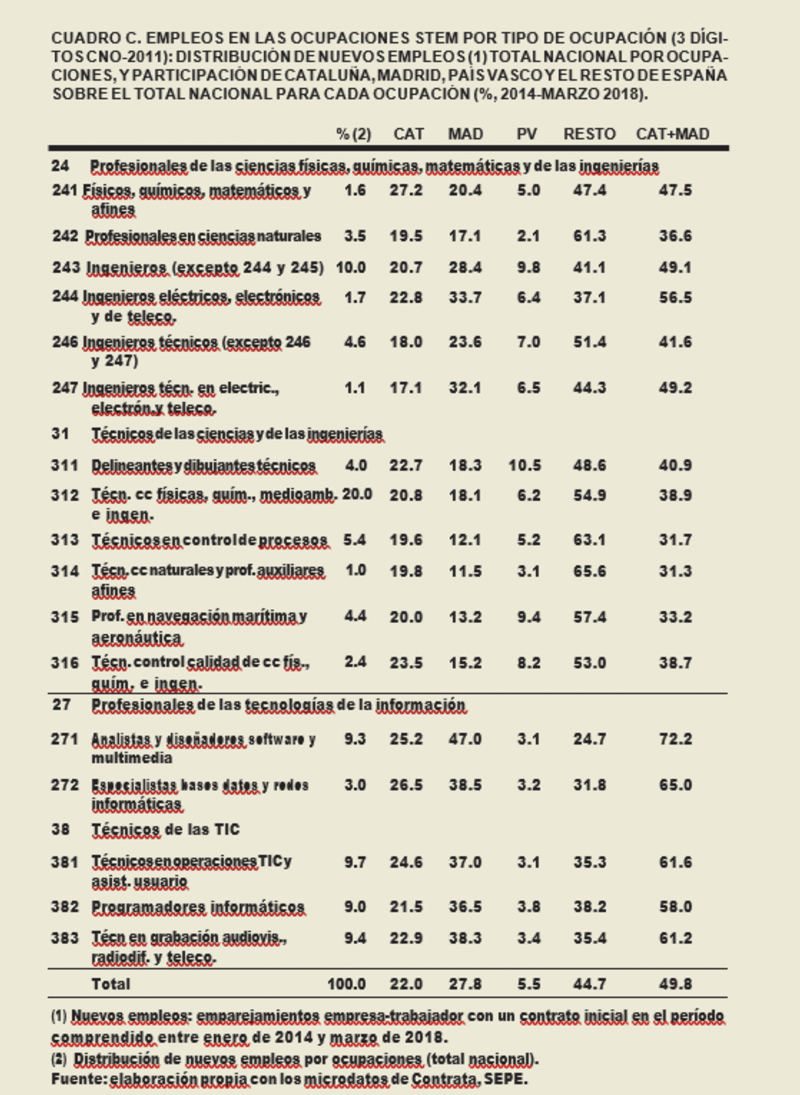 En Felgueroso (2019) se muestra, con el apoyo de la base de datos de contratos registrados a lo largo de esta década, que el hecho diferencial de la Comunidad de Madrid dentro de las ocupaciones STEM es el alto volumen de emparejamientos en las ocupaciones TIC. Casi la mitad de los empleos de analistas y diseñadores de software y multimedia del país trabajan en centros de trabajo de esta comunidad. Sumando Cataluña, alcanzarían conjuntamente cerca del 70% de los empleos TIC de nivel superior del país, es decir, del total profesionales TIC, y cerca del 60% de los técnicos y profesionales de apoyo de las TIC (cuadro C).
