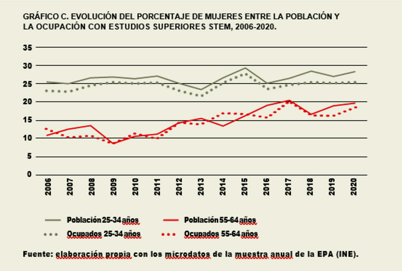Igualmente, el porcentaje de titulados STEM entre aquellos con un nivel educativo superior fue del 25,4% en ambos años y, en particular, entre los universitarios fue del 19% en 2006 y 2020. Además, como se puede ver en el gráfico A, también se ha mantenido la distribución de personas por estudios STEM por niveles educativos.