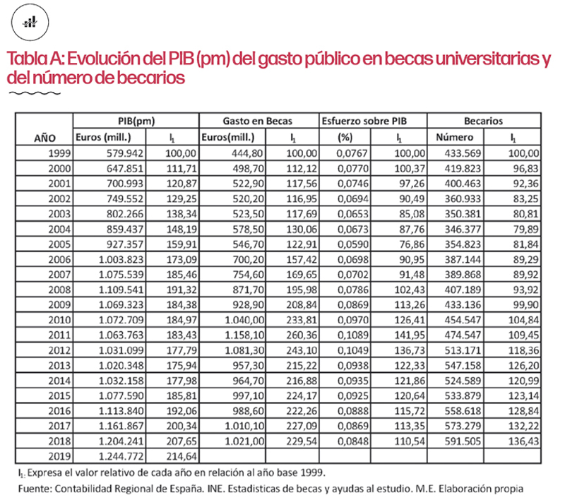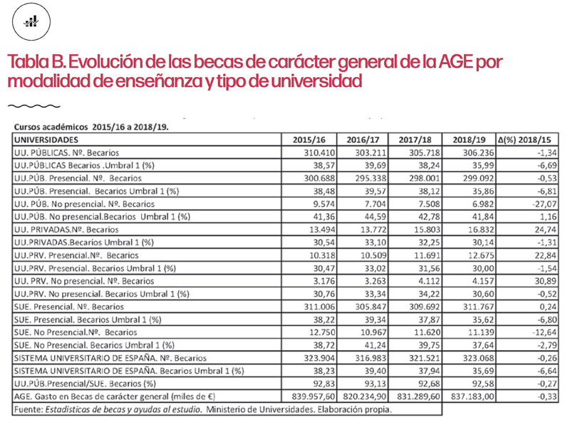 "Canalizar el aumento de gasto público a reforzar selectivamente las ayudas al estudio es, en nuestra opinión, la vía más directa para avanzar eficazmente en la igualdad de oportunidades. En esta dirección, se enmarca las modificaciones introducidas por el actual Gobierno de España destinadas a revertir los cambios de la anterior legislatura y que hasta la fecha se han concretado en el RD 688/2020, de 21 de julio. Modificaciones, que afectan a los requisitos académicos de los becarios de la AGE para el acceso a las ayudas económicas correspondientes a las modalidades de cuantía fija y variable; al aumento de las dotaciones de las ayudas de cuantía fija (renta 1.700€; residencia 1.600€) y a la revisión al alza de la renta familiar aplicable para determinar el computo de los estudiantes becarios pertenecientes al umbral 1 (de 13.909 a 21.054 €, para familias de 4 miembros).