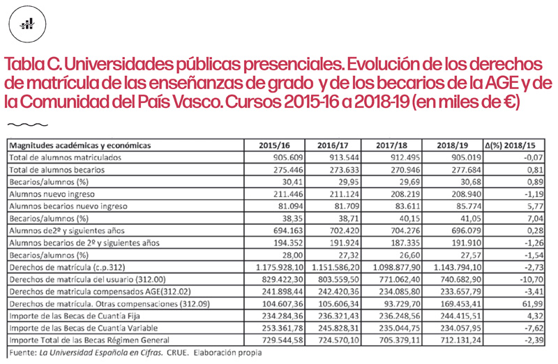 Reduciendo un poco más el foco de atención la observación que permite aproximar el alcance de la política económica destinada a avanzar en la igualdad de oportunidades se centra en los alumnos matriculados en los centros propios de las universidades públicas presenciales que reúnen la condición de becario de la AGE y en los importes de las matrículas de grado reconocidos en los presupuestos de estas instituciones. La información que permite cuantificar el alcance de las actuaciones destinadas a avanzar en la igualdad de oportunidades se muestra en la tabla C, con datos referidos al colectivo de las universidades públicas presenciales que pueden ser consultados en el detalle institucional en la publicación de la CRUE: La Universidad Española en Cifras.