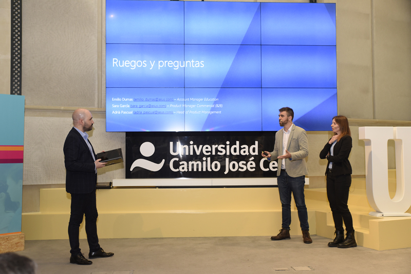 El presentador, Borja Beriain (izq.) junto a Adrià Pascual y Sara García, de Asus (dcha.)
