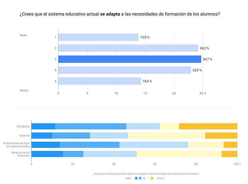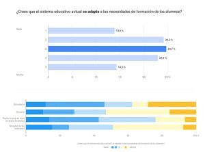 Según los datos de la encuesta, existe una división de percepciones a la hora de valorar si el sistema educativo actual se adapta a las necesidades de formación de los alumnos. Un 37% considera que se adapta a las necesidades de los alumnos, mientras que un 38% considera que se adapta poco (24%) o nada (14%).