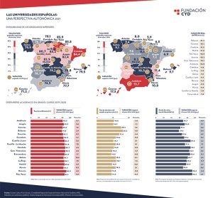 La Fundación CYD (Conocimiento y Desarrollo) presidida por Ana Botín, ha publicado el informe Las universidad españolas. Una perspectiva autonómica 2021, que ofrece la información más relevante contenida en el Informe CYD 2020 desglosada territorialmente, por regiones y universidades dentro de cada región. La publicación se compone de un total de 18 informes individuales, incluyendo el conjunto de las universidades por comunidades y a nivel español.