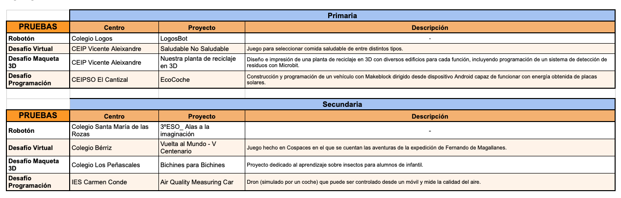 En esta ocasión, han resultado seleccionados los proyectos “LogosBot”, del Logos International School (Robotón Primaria); “Alas a la imaginación”, del Colegio Santa María de Las Rozas (Robotón Secundaria); “Saludable/No Saludable”, del CEIP Vicente Aleixandre (Desafío Virtual Primaria); “Vuelta al Mundo-V Centenario”, del Colegio Bérriz (Desafío Virtual Secundaria); “Nuestra planta de reciclaje en 3D”, del CEIP Vicente Aleixandre (Desafío Maqueta 3D Primaria); “Bichines para Bichines”, del Colegio Los Peñascales (Desafío Maqueta 3D Secundaria); “EcoCoche”, del CEIPSO El Cantizal (Desafío Programación Primaria), y “Air Quality Measuring Car”, del IES Carmen Conde (Desafío Programación Secundaria).
