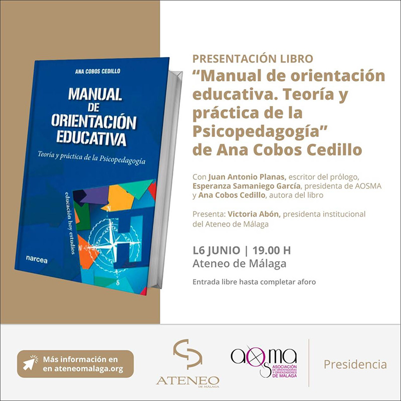 Ana Cobos Cedillo estará presentando Manual de orientación educativa. Teoría y práctica de la Psicopedagogía el próximo 6 de junio en el Ateneo de Málaga. Lo hará acompañada de la presidenta del Ateneo, Victoria Abón; Juan Antonio Planas, orientador educativo y presidente honorífico de Copoe, y Esperanza Samaniego García, orientadora educativa y presidenta de la Asociación de Orientadores y Orientadoras de Málaga (Aosma).