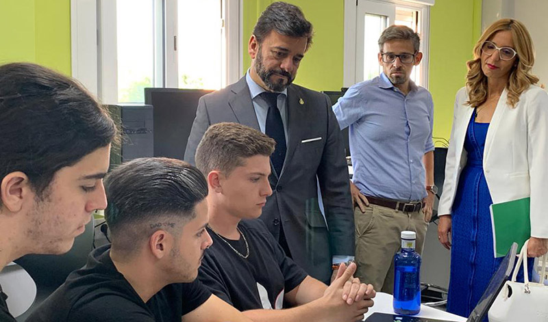 El consejero Manuel Alejandro Cardenete conversa con alumnos del Centro Público Integrado de FP "Los Viveros" de Sevilla.