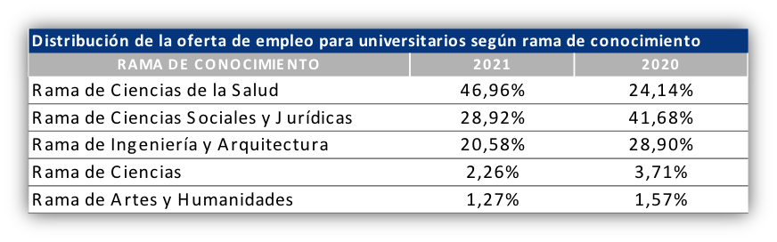 Las condiciones excepcionales que se han desarrollado en estos dos últimos años han convertido al sector sanitario en el mayor demandante de candidatos con formación universitaria. El sector de la enseñanza es el segundo que más demanda titulaciones universitarias. Ambas han visto aumentada la demanda de titulación en los últimos años, suman entre las dos un 46,70%. Lo que significa que este porcentaje de las ofertas en ambos sectores requieren titulación universitaria.