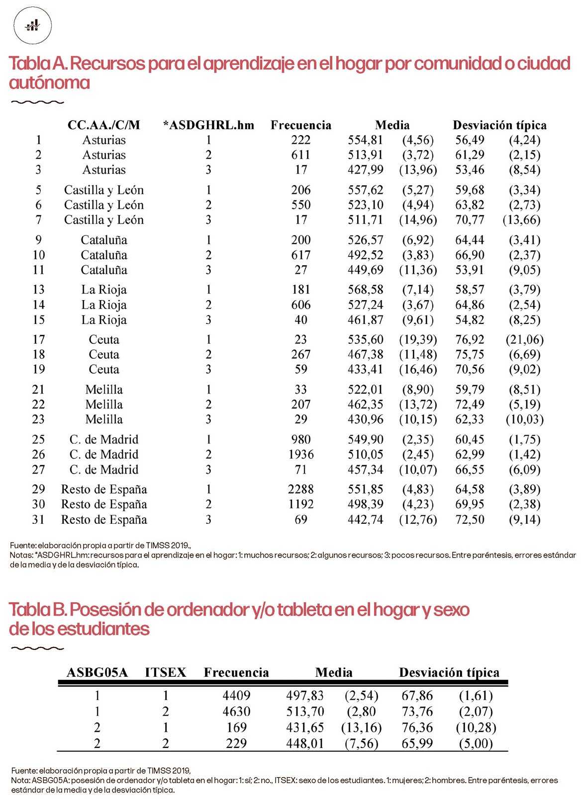 La relación entre esos recursos y el rendimiento en Matemáticas confirma lo que ya se sabe: una relación consistente y positiva entre rendimiento académico y situación socioeconómica de la familia (Dahl and Lochner, 2012; Martin, Foy, Mullis y O’Dwyer, 2013). La tabla A muestra ese resultado para los estudiantes españoles de 4º de Primaria para las tres categorías de la escala «Recursos para el aprendizaje en el hogar»: “muchos recursos”, “algunos recursos”, “pocos recursos”.