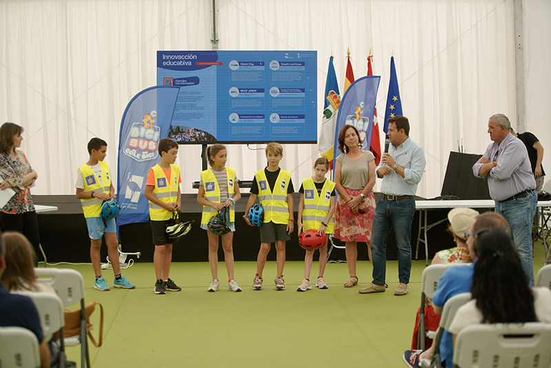 Tras la muestra de estos proyectos, protagonistas de una revolución verde en las aulas, los alumnos participantes en el proyecto piloto Bicibús trasladaron su experiencia, en presencia del alcalde pero también de la concejal de Educación, Mercedes Piera, y del concejal de Deportes, Juan Cabrera. Se trata de un proyecto puesto en marcha en este último trimestre del curso en 5º y 6º de Primaria en los colegios del Distrito Sur CEIP «La Encina», «Los Jarales», Colegio «Zola», CEIPSO «El Cantizal», CEIP «Mario Vargas Llosa» y «Los Olivos» para fomentar el uso de la bicicleta como medio de transporte en el trayecto de casa al cole y del cole a casa.