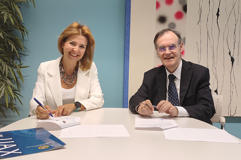 Ana Isabel Fernández, rectora de la UAX y Aureo Ruiz de Villa, presidente de Siena Educación, en la firma del convenio.