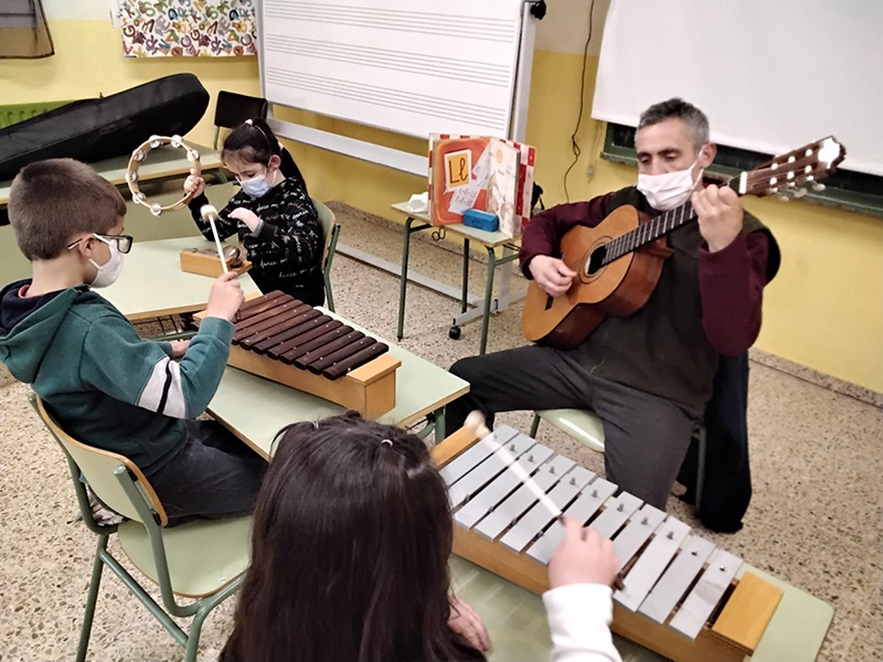 Como complemento a esta actividad, en colaboración con la empresa Educo, tenemos la suerte de disponer de un maestro especialista en música que, dos veces por semana, atiende a nuestro alumnado más joven llevándoles a un mundo de literatura, música, poesía y movimiento, a través de la fantasía, de forma lúdica y empírica.