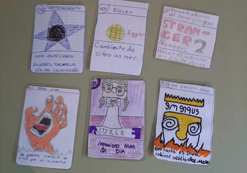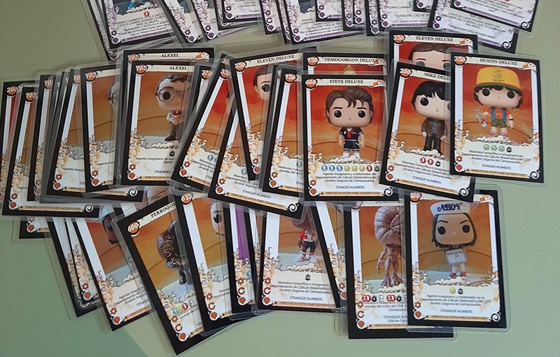 —Aquí hay un gasto de dinero considerable, al menos en la forma en la que yo trabajo, pero eso es porque yo quiero trabajar así. Para la gamificación no hace falta gastarse tanto. Hay gente que esto mismo lo puede hacer de manera online. De hecho, yo tengo un apartado dedicado a que lo alumnos puedan trabajar de manera online. Lo que pasa es que a mí me gusta mucho la manipulación porque los niños siguen siendo niños, mis alumnos salen al patio con cromos. Entonces, yo genero recompensas, los niños con sus pruebas de cálculo individuales y colectivas obtienen puntos, algunos son de manera individual para ascender en la agencia de cálculo, y otros son colectivos que sirven para cerrar los portales que abre el demogorgon. Los puntos individuales pueden canjearlos por cartas, que al final para ellos son como cromos y las hago de dos tipos: de recompensa, que pueden ser, por ejemplo, cinco minutos más para acabar el examen, la clase se gana diez minutos para salir al recreo o ser el primero en la fila, y luego están las cartas edición coleccionista que en un primer momento no eran físicas, sino que las obtenían pero no las tenían. Había niños que me decían que querían tenerlas de recuerdo, entonces saqué la edición coleccionista (creé las cartas de los personajes en físico), que triunfa más que las recompensas. Porque los alumnos compran cartas para tenerlas ellos mismos, luego juegan con ellas en el patio.