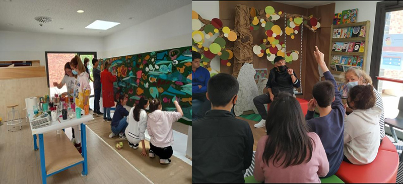 - Día del libro. Hemos celebrado el día del libro con una actividad general de centro con la participación de todo el alumnado de las distintas etapas. Se ha montado un rincón de lectura en hall del colegio, con la temática de un libro de los creadores cántabros Alberto Gallo y Almudena Báscones, El día que pintaron el mundo.