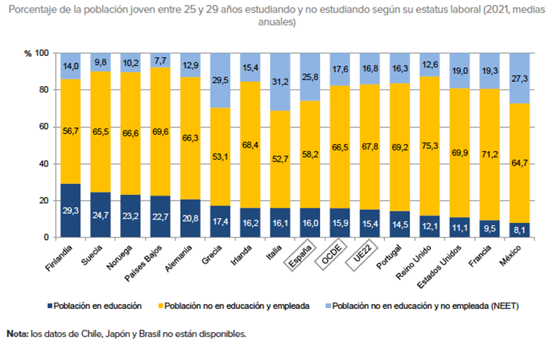 Analizar la situación de los jóvenes españoles de 25 a 29 años ayuda a entender la transición desde el sistema educativo al mercado laboral de los jóvenes universitarios, ya que la mayoría de los jóvenes de estas edades que cursan estudios terciarios todavía están estudiando. En 2021, un 16% de estos jóvenes estaba estudiando, porcentaje similar a la media de los países de la OCDE (15,9%), y de la UE22 (15,4%). Sin embargo, el porcentaje que no estudia pero trabaja era del 58,2%, inferior a la media de la OCDE (66,5%) y de la UE22 (67,8%). Por su parte, y esto es lo más preocupante, el porcentaje de jóvenes que no estaba estudiando ni trabajando era de 25,8%, proporción más elevada que la media de la OCDE (17,6%) y de la UE22 (16,8%). Todo ellos según el recientemente conocido informe Panorama de la Educación 2022, que publica la OCDE.