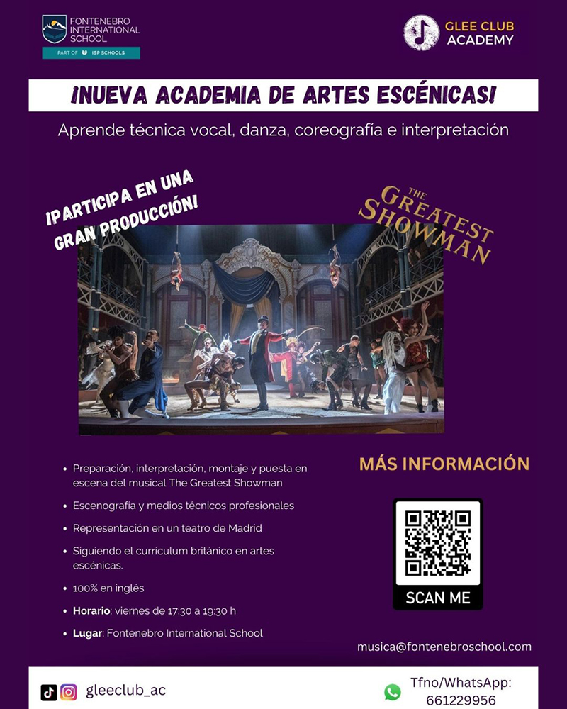 «Fontenebro International School» anuncia la apertura de la academia de artes escénicas “Glee Academy”, la única academia de la Sierra que sigue el currículo británico en «Performing Arts». Todos los viernes a las 17:30 a 19:30h los alumnos podrán asistir al colegio «Fontenebro International School» para aprender técnica vocal, danza, coreografía e interpretación. La academia es apta para todas las edades y pueden participar tanto familias internas como externas al colegio. Hay plazas limitadas.
