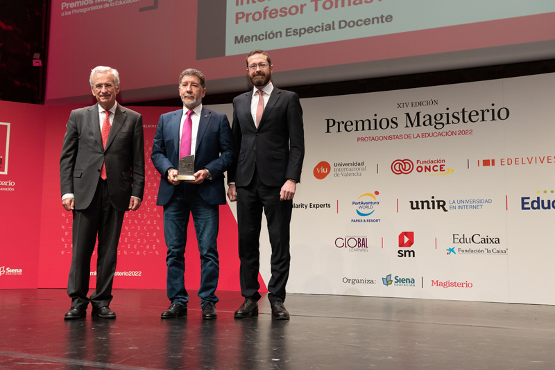 "La Mención Especial Docente se otorgó, por su contribución a la dignificación de la FP, a Tomás Alonso, director del IES “Francisco Tomás y Valiente” de Madrid, quien recibió el premio de mano de Jesús Enrique Albertos, decano de la Facultad de Ciencias de la Educación de la Universidad Internacional de Valencia (VIU), institución que se suma en esta edición a la iniciativa de Siena Educación de reconocer anualmente la trayectoria de un docente referente para la comunidad educativa. Albertos, que celebró esta colaboración, incidió en que “el profesorado siempre está en el centro de nuestra actividad educativa”.