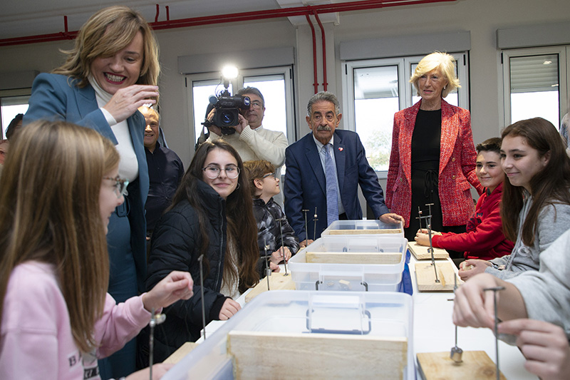 El director del centro, Marcos Carrasco, ha guiado al presidente, a la consejera y a la ministra en un recorrido por el colegio, que ha comenzado en el ‘Espacio Leonardo Torres Quevedo-Valle de los Inventos’, el museo dedicado al ilustre ingeniero cántabro. Allí han coincidido con un grupo de estudiantes del colegio Dobra de Torrelavega, inmersos en el desarrollo del taller de física ‘El Transbordador, invento cántabro’, en compañía del guía del museo, Daniel Cubas.