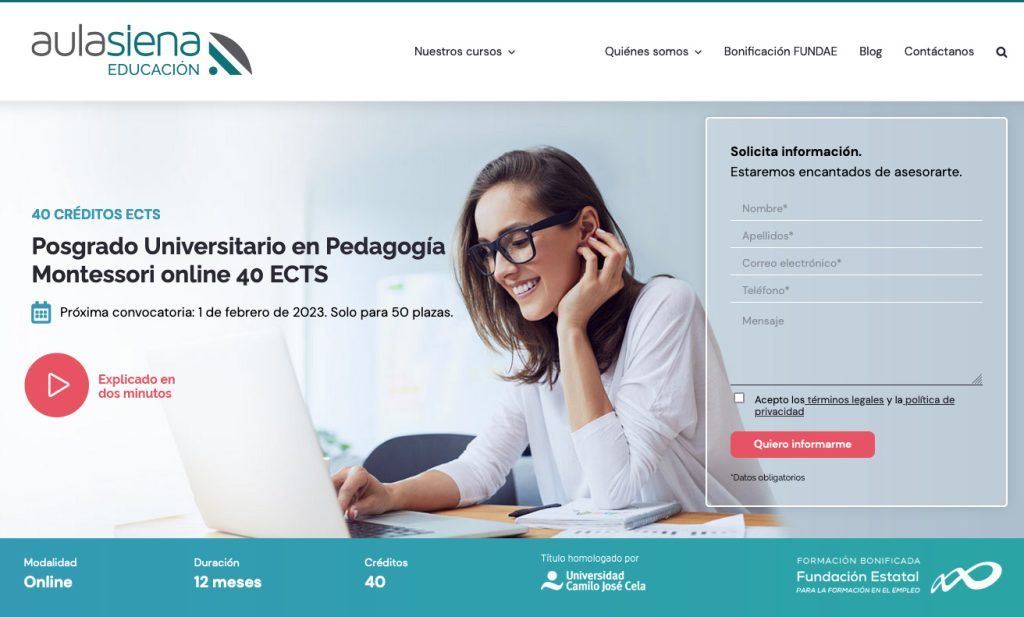 Aula Siena y la Universidad Camilo José Cela (UCJC) impulsan la segunda edición del posgrado internacional Experto Universitario en Pedagogía Montessori con 40 ECTS. El objetivo de este programa, incluido dentro del plan de formación del profesorado de la UCJC, es formar a los profesionales que requieren los sectores económicos y sociales más innovadores en materia educativa. Por este motivo, los estudios tendrán una orientación más práctica con fines de poder incorporarse al mercado laboral de manera inminente.