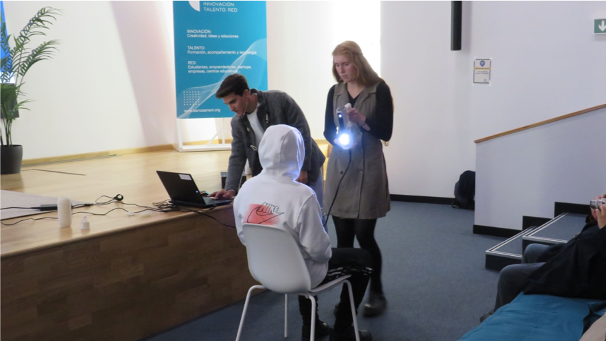 Además, Fabricio Santos mostró ejemplos para que los alumnos apreciaran de primera mano el resultado de esta impresión. Entre todos eligieron a una persona del público para hacer una demostración de impresión 3D. Con un escáner, los estudiantes de arquitectura de la UFV copiaron a la perfección las facciones del alumno para luego enviar esa información a la impresora 3D, que emitiría el resultado. En el camino, utilizaron un ordenador con un programa específico para pulir la silueta del contenido que se iba a imprimir, en este caso, la cara del joven.
