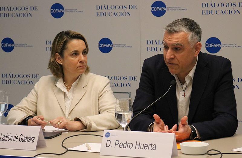 El secretario general de Escuelas Católicas, Pedro Huerta durante su intervención, junto a la presidenta de Cofapa, Begoña Ladrón de Guevara.