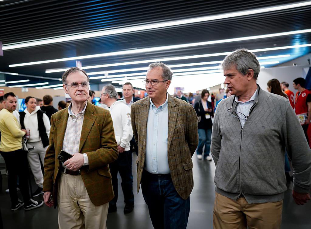 De izda. a dcha., Áureo Ruiz de Villa, presidente de Siena Educación; Enrique Ossorio, vicepresidente y consejero de Educación y Universidades de la Comunidad de Madrid; y José María de Moya, director general de Siena Educación, recorren los stands de la Feria de los Colegios en el estadio Cívitas Metropolitano / COMUNIDAD DE MADRID.