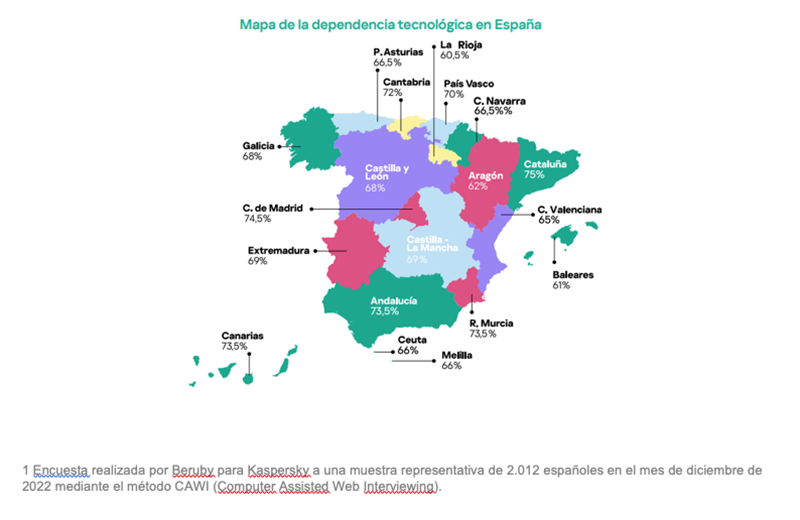 Por comunidades autónomas, los madrileños se sitúan en segunda posición de los españoles con más dependencia de la tecnología, solo después de Cataluña y seguida por Canarias. Por sexos, los hombres (44%) son más dependientes de la tecnología que las mujeres (36%). En lo que respecta a las edades, destacan los grupos comprendidos entre 18 y 25 (100%), 36 y 45 (83%) y 26 y 35 años (79%).