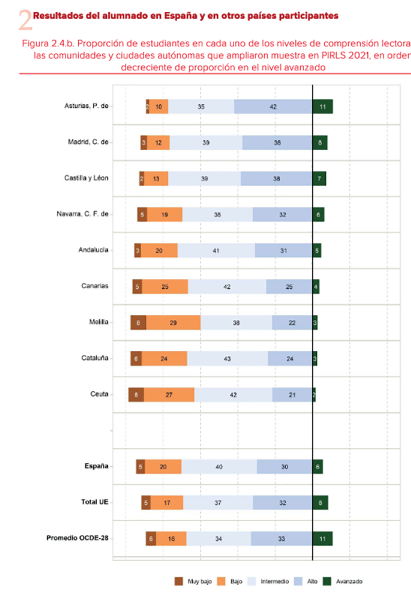 Según el estudio, la comprensión lectora es muy superior a la media de España en Asturias, Madrid y Castilla y León, especialmente en el caso del Principado. La parte autonómica publicada hoy por el Ministerio de Educación señala que los territorios que obtienen una puntuación por debajo de la media española son Navarra (524), Andalucía (523) Canarias (510), Cataluña (507), Melilla (499) y Ceuta (498). En el otro extremo, Asturias (550), Comunidad de Madrid (539) y Castilla y León (538) registran una media superior a la del conjunto de España.