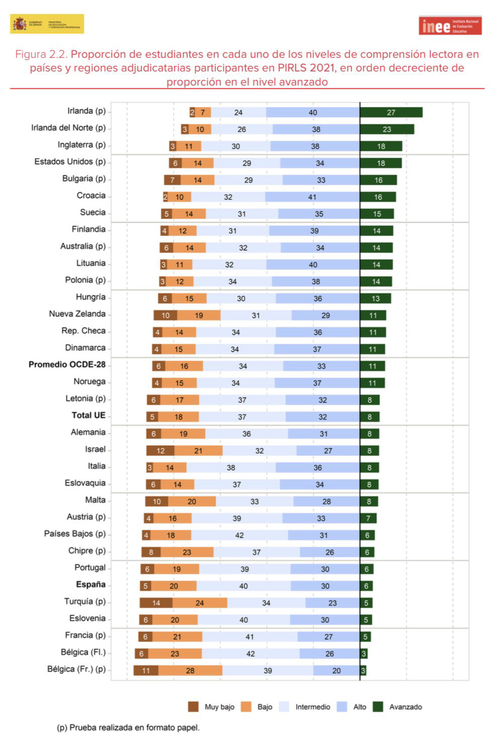 Así lo refleja el avance del Estudio Internacional de Progreso en Comprensión Lectora (PIRLS, en sus siglas en inglés), la primera gran evaluación internacional tras la covid-19, que mide la comprensión lectora del alumnado en su cuarto curso de escolarización obligatoria (4º de Primaria en el caso español). En el análisis de la Asociación Internacional para la Evaluación del Rendimiento Educativo, divulgado este martes y que se repite cada cinco años, han participado 57 países de la OCDE y de la UE, con una muestra de 140.000 alumnos, 120.000 de ellos de la Unión y más de 10.000 de España.