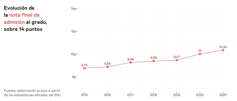 Para el caso del expediente de Bachillerato (la segunda de las tres partes de la nota final de admisión que más crece después de la prueba específica), los incentivos creados por la elevación del 50 al 60% de la nota del expediente en el año 2000, los cambios en la prueba general en 2017 (que redujo la opcionalidad de la fase general y que provocó un aumento de las notas de Bachillerato) y las medidas excepcionales ante la pandemia para la evaluación de Bachiller, tuvieron un «claro» efecto alcista.