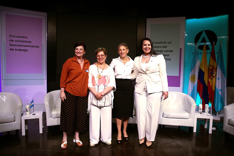 Díaz ha acogido este lunes en Madrid un encuentro en el que han participado la ministra de Trabajo, Empleo y Seguridad Social de Argentina, Raquel Kismer de Olmos; la ministra del Trabajo de Colombia, Gloria Inés Ramírez Ríos; la secretaria de Trabajo y Seguridad Social de Honduras, Sarahí Cerna. Organizado bajo el lema «Hacia una internacional laborista iberoamericana. Construir un futuro del trabajo verde y feminista para el siglo XXI», en el acto las ministras han analizado las medidas tomadas y los avances en sus agendas nacionales en materia laboral.